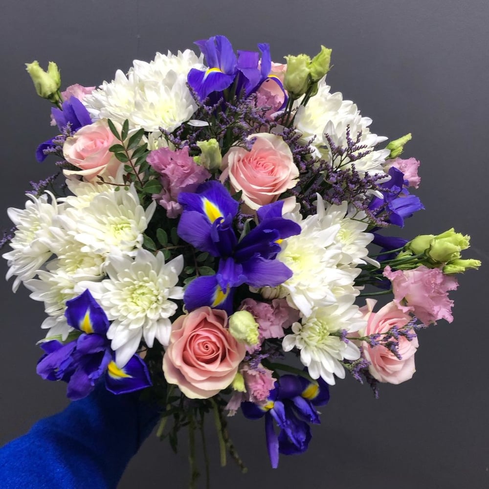 Яркий букет с ирисами, лизиантусами и хризантемой кустовой добавит красок и позитивного настроения на долгое время