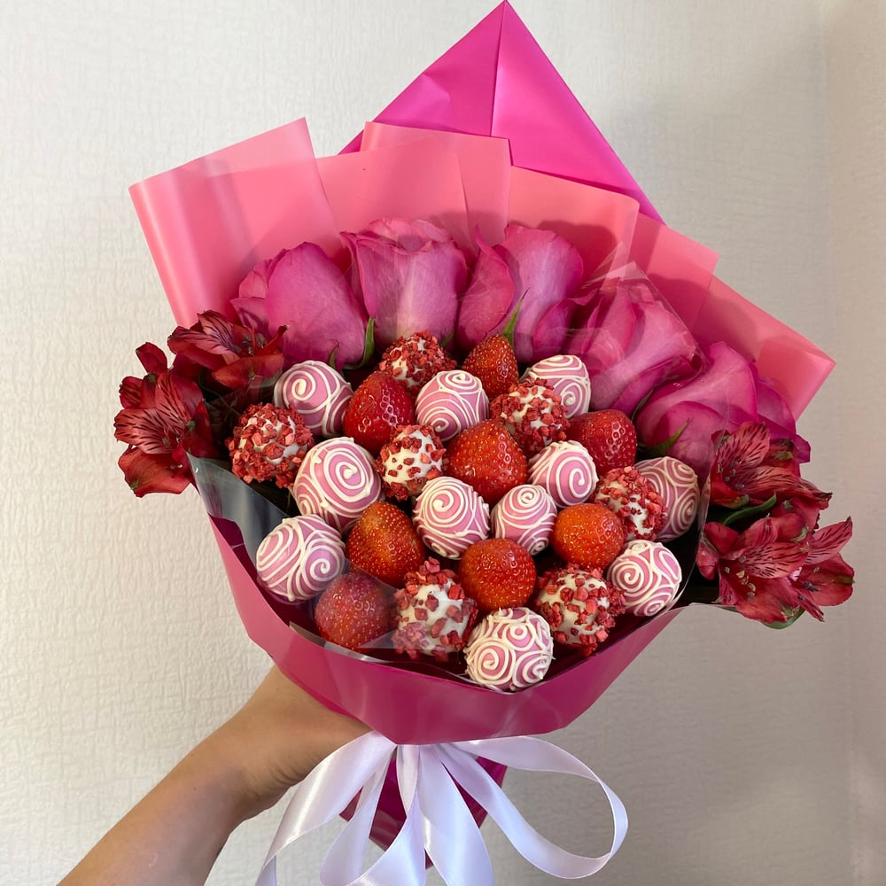 Отборная клубника, розы эквадор, альстромерия, сублимированная малина