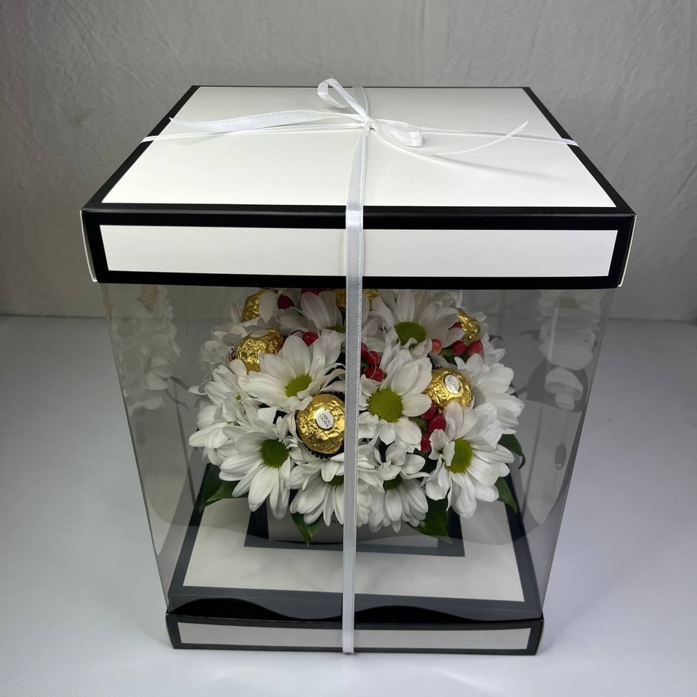 Коробка с цветами «Букет с конфетами Rocher "Счастье"» из хризантем