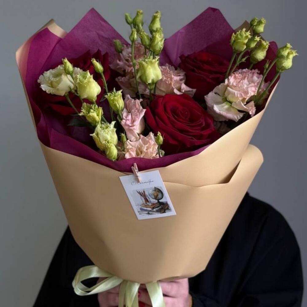 Букет с красными розами и лизиантусами из эустом