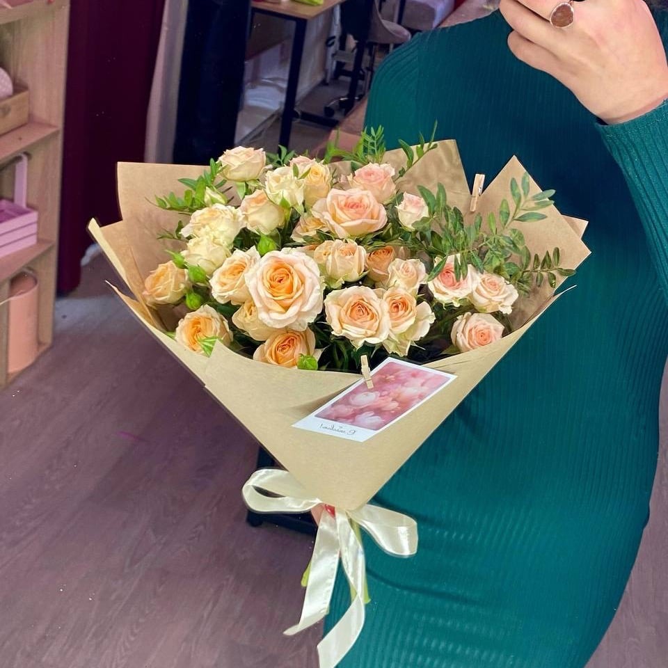 Букет из кустовых роз сорта Свит Сара с листьями фисташки
