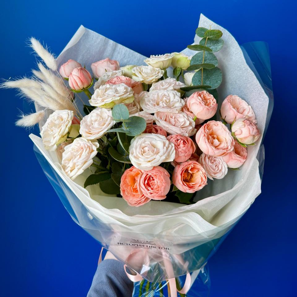 Этот букет из кустовых роз выглядит живо и естественно: множество бутонов — от плотных до распустившихся — создаёт объёмную, но воздушную композицию. Нежные оттенки мягко перетекают друг в друга, а с…