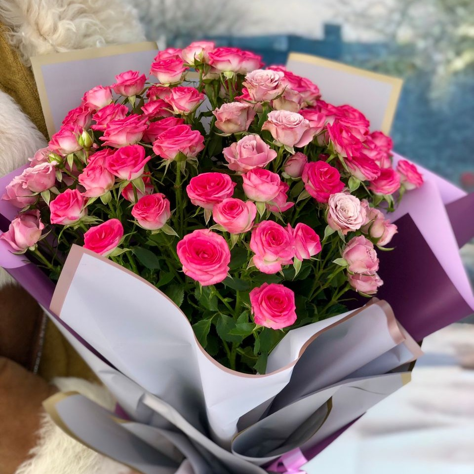 Лента - 1 шт. Кустовая роза - 15 шт. Дизайнерская упаковка - 1 шт.