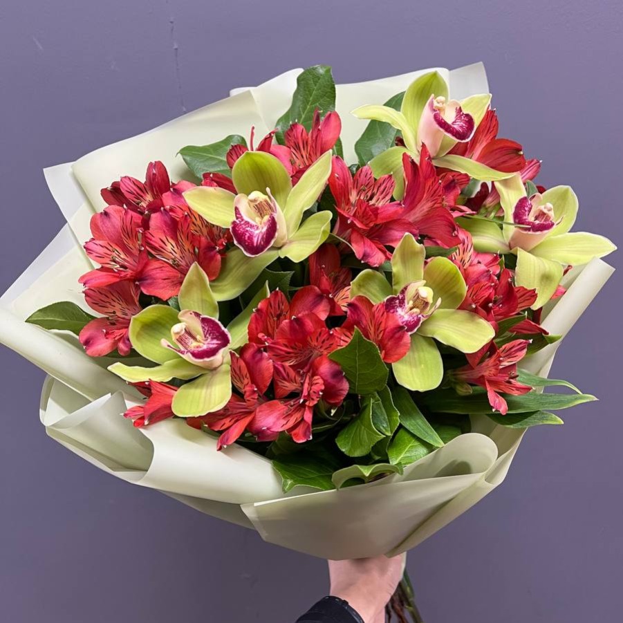 Букет с зелеными орхидеями и красными альстромериями с зеленью в дизайнерской упаковке