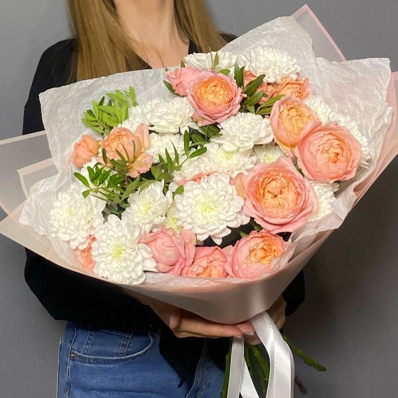 Букет с пионовидной кустовой розой из хризантем