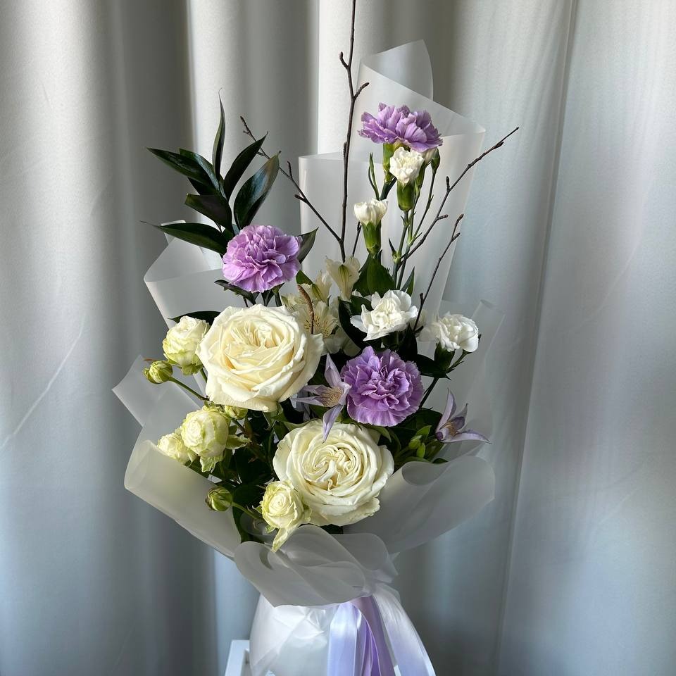 Этот букет — воплощение элегантности и романтической красоты. В его основе лежат пышные пионовидные розы, которые отличаются своими крупными, многослойными бутонами и нежным ароматом. Диантусы (или гвоздики) добавляют композиции изысканности и утончённости, а клематисы вносят элемент воздушности и лёгкости. Всё вместе создаёт гармоничное сочетание текстур и оттенков, которое порадует глаз и душу. Особенности: Эстетика: Букет выглядит дорого и стильно, идеально подходит для особых случаев, таких как свадьба, юбилей или просто как знак внимания. Долговечность: Правильно подобранные цветы обеспечивают продолжительное удовольствие от созерцания букета. Аромат: Нежный и тонкий, создающий атмосферу уюта и гармонии. Этот букет станет отличным выбором для тех, кто ищет нечто особенное и запоминающееся для мамы, любимой девушки или подруги. Подарок, способный передать всю глубину чувств и эмоций.