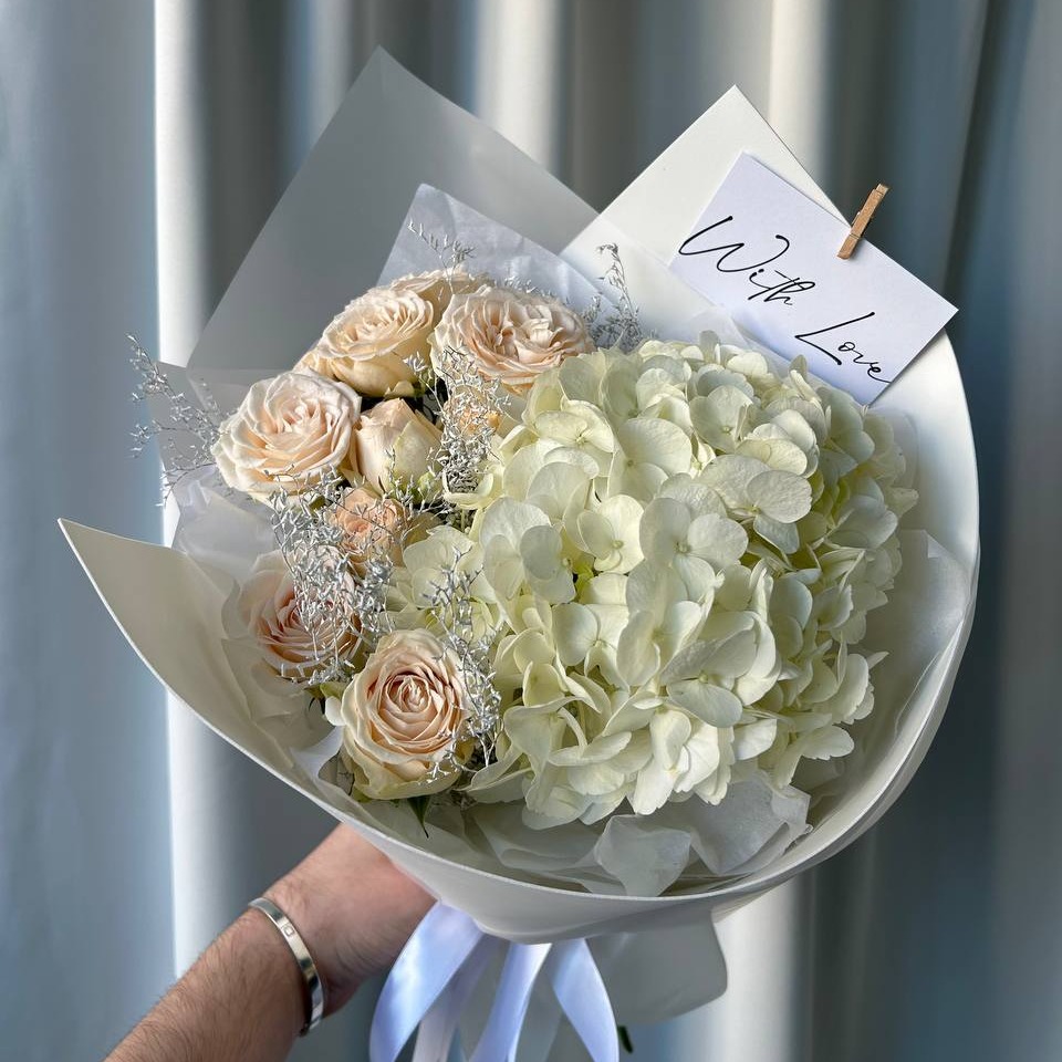 Изысканная композиция, в которой благородная гортензия гармонично переплетается с пышными кустовыми розами сорта “Софи”. Букет дополнен элегантными белыми сухоцветами, что придает ему особую глубину и объем. Состав букета: • Крупные соцветия гортензии • Кустовые пионовидные розы “Софи” • Белые сухоцветы для акцентов • Стильная дизайнерская упаковка • Подарочная открытка для ваших пожеланий Этот букет станет прекрасным подарком для любого случая, особенно если вы хотите выразить нежность и заботу. Сочетание гортензии и роз создает особую атмосферу уюта и тепла.