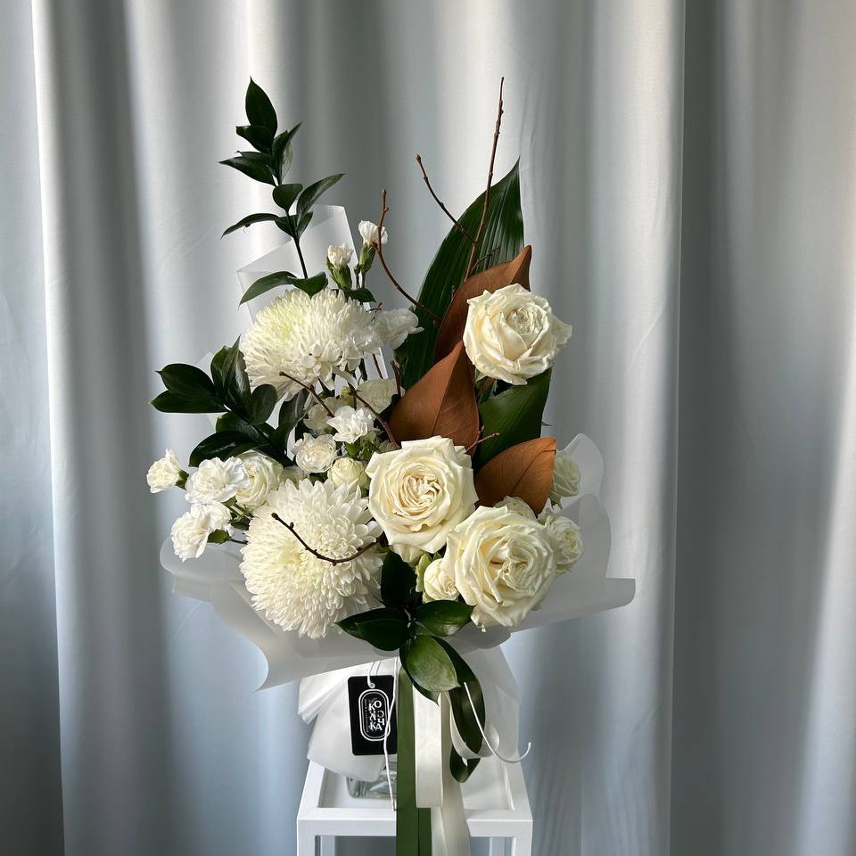 Гармоничное сочетание кустовых и одноголовых пионовидных роз, дополненное одиночной хризантемой, листьями магнолии и рускуса. Букет представлен в стильной упаковке, идеально подходящей для подарка. Почему стоит выбрать этот букет? Эксклюзивность: Авторская композиция, созданная профессионалами флористики. Разнообразие: Сочетание различных видов цветов и зелени создает уникальный визуальный эффект. Стиль: Современный дизайн упаковки делает букет идеальным подарком для любого случая. Этот букет станет прекрасным выбором для тех, кто ценит оригинальность и хочет удивить близких неповторимым цветочным ансамблем.