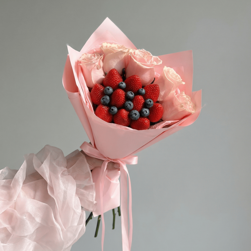 В состав букета входит: — 250 грамм свежей клубники и голубики — 5 розовых роз — композиции собираются по весу, а не по количеству: ягоды могут отличаться по размеру и сорту, поэтому точное количество может варьироваться — в букете 200 гр. Клубники, примерно 10 ягод — примерный размер: 30 см в диаметре, 45 см в высоту — каждый букет уникален, ведь он создаётся вручную — внутри брошюра с информацией о сроке годности, хранении и транспортировке — дизайнерская упаковка с атласной лентой 🎀 — клубника бережно упакована в прозрачную плёнку для защиты от внешних факторов и от контакта с цветами —при необходимости букет может быть отправлен на акваножке (специальный пакет с водой). Если хотите добавить её к заказу, напишите нам, мы учтём ваши пожелания. — в каждый букет добавляется инструкция по уходу за цветами и кризал подкормка для срезанных растений ✨ натуральный продукт. Срок годности — до 48 часов. Хранить в холодильнике при температуре +4…+8°c ❄️