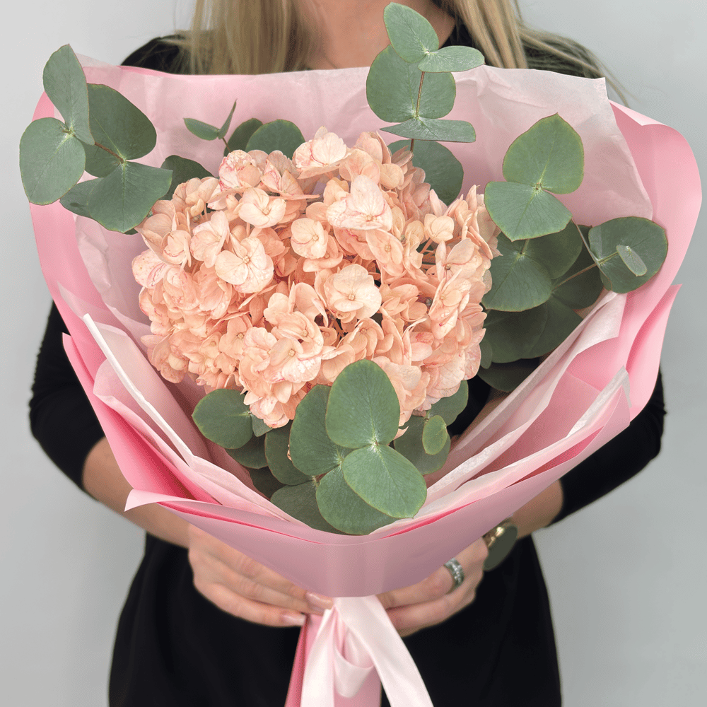 Букет с розовой гортензией и эвкалиптом