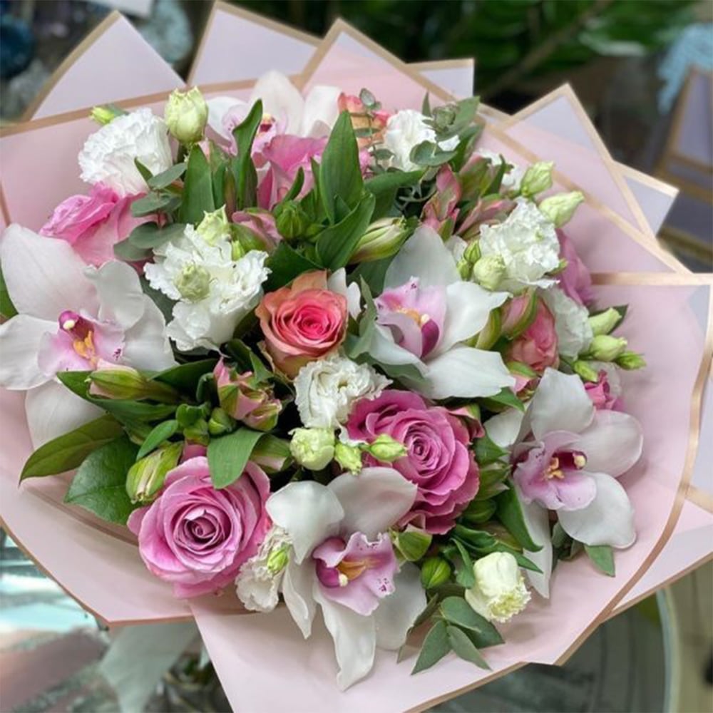 Объемный букет из экзотических орхидей, нежных роз, элегантной эустомы и альстромерий покорит не только красотой, но и стойкостью !