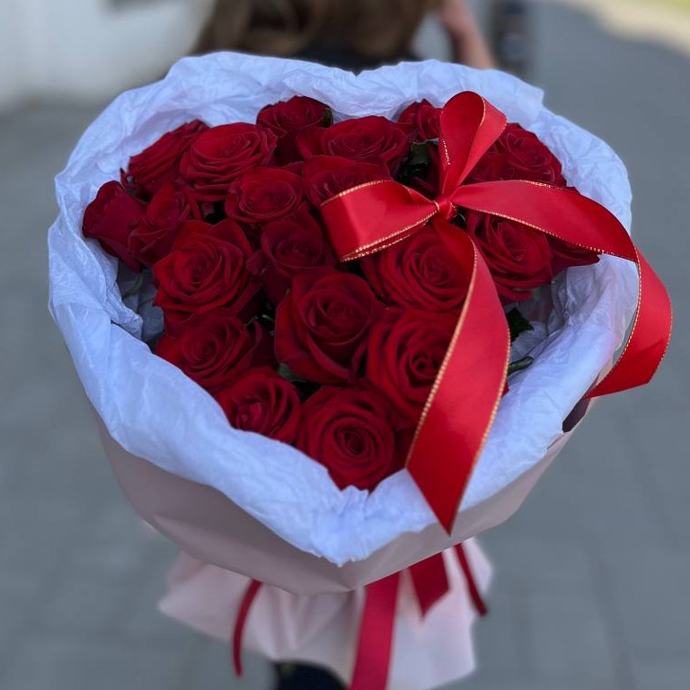Этот букет включает в себя 21 красную розу, которая является символом страсти и любви. Букет упакован в тишью в виде сердца, готов покорять Ваших любимых и близких людей. Завершается композиция атласной лентой, придающей букету изысканный вид. Идеальный подарок для выражения искренних чувств и эмоций.