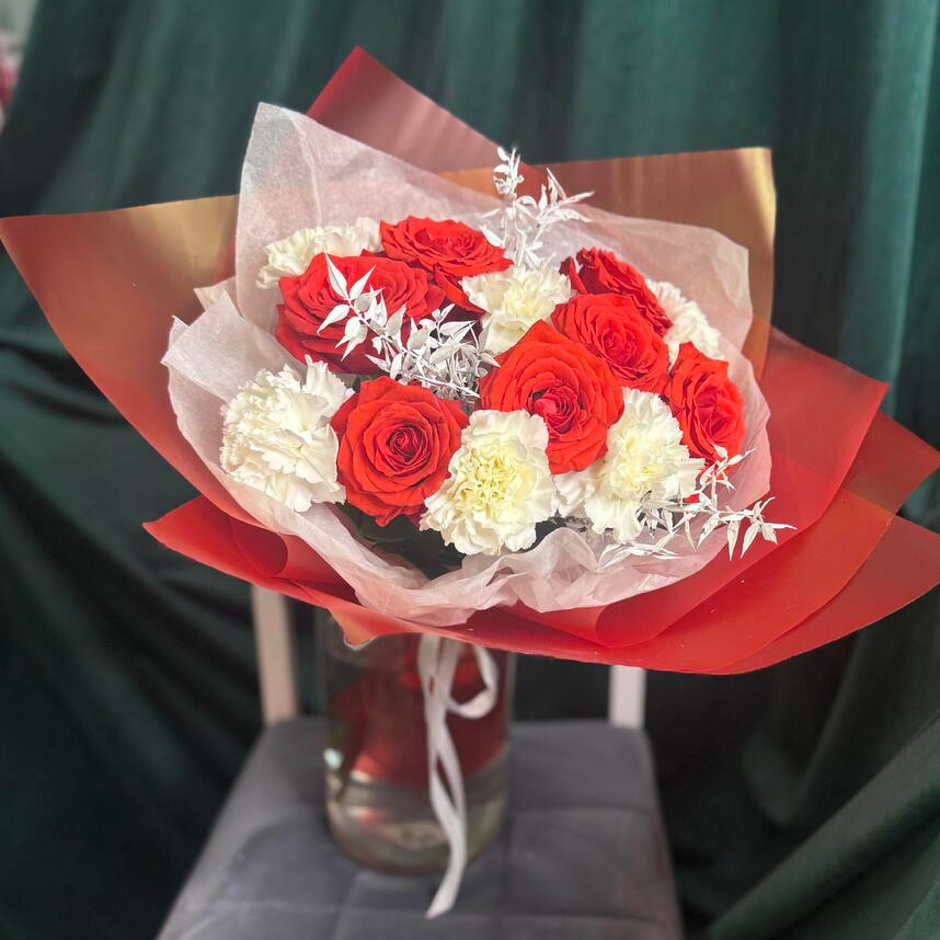 Букет Снег и пламя из роз и гвоздик