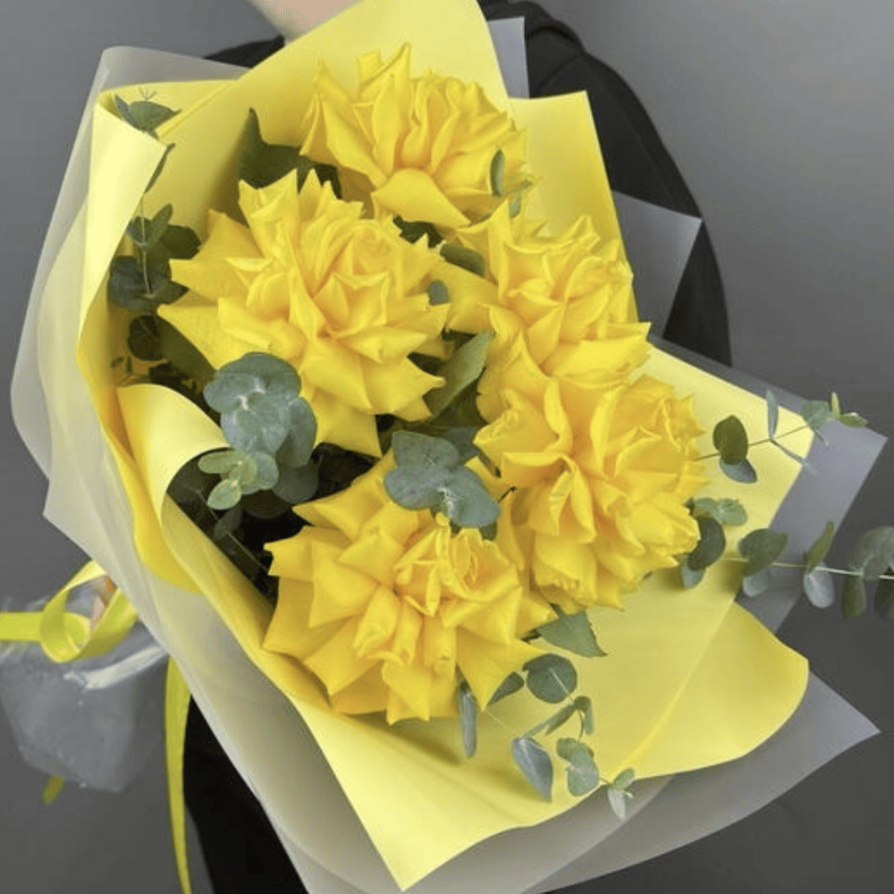 Букет солнечных фланцузких роз с эвкалиптом