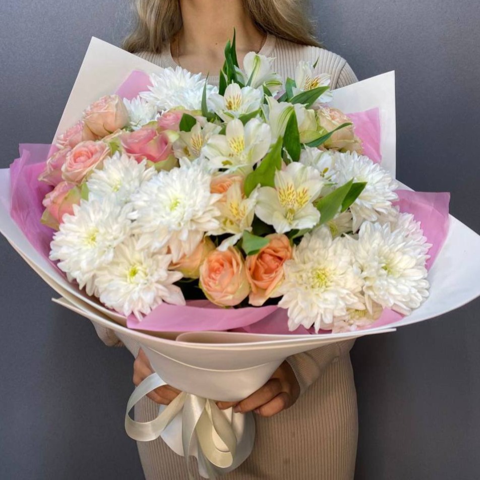 Этот букет — воплощение нежности и утончённости. В его составе гармонично сочетаются розовые розы, белые хризантемы и альстромерии. Нежные оттенки цветов создают атмосферу романтики и тепла, а их с...