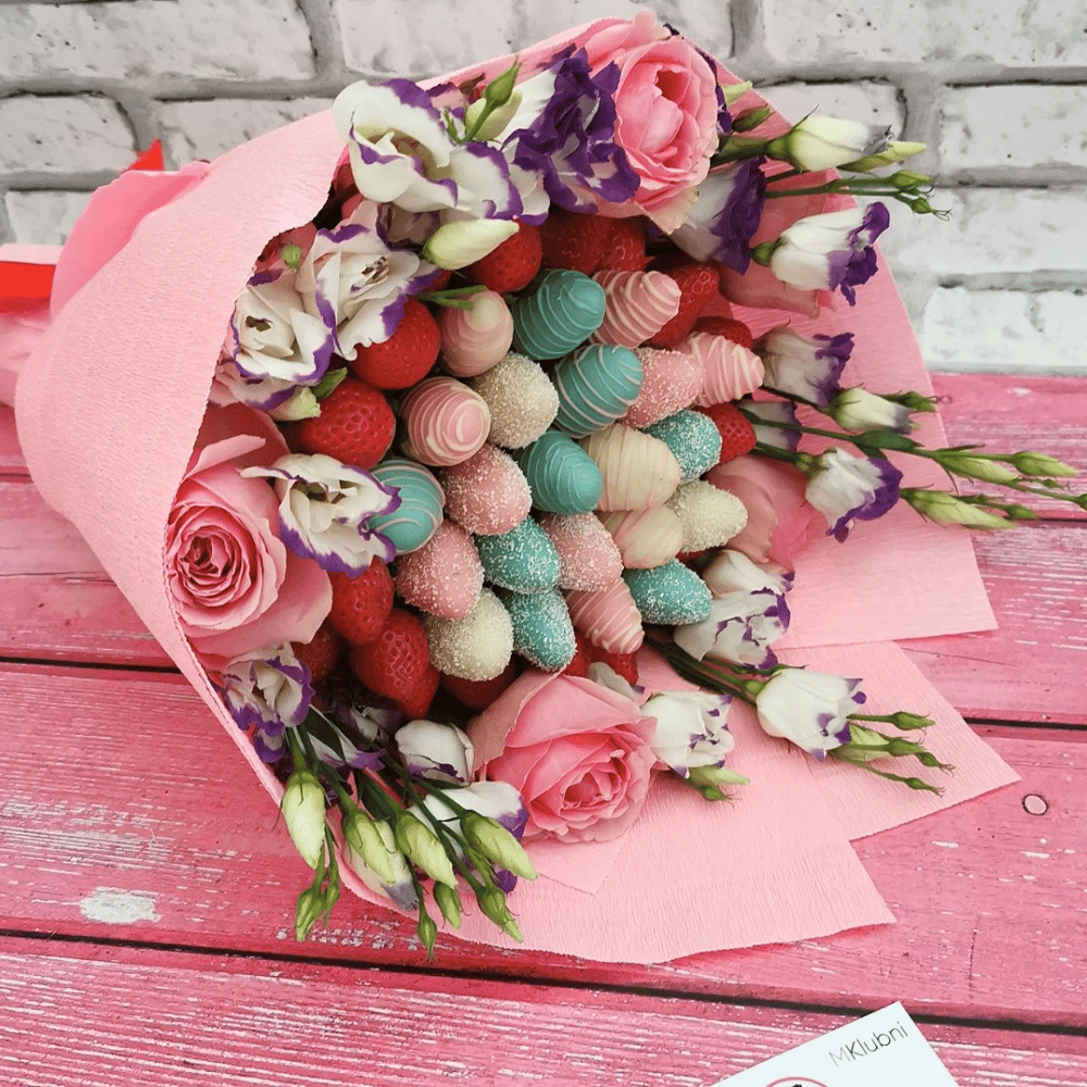 Чудесный яркий клубничный букет с добавлением роз и эустомы. Разноцветный бельгийский шоколад делает этот букетик еще более живым и сочным!