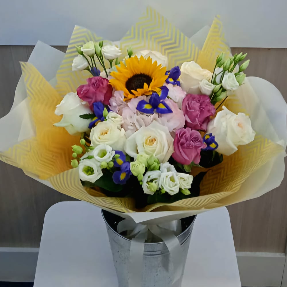 Солнечный букет - это настоящий топ у наших получателей. Всегда море позитивных эмоций и приятных ассоциаций. В букете вы найдете настоящее лето - зеленых цветущий луг, летнее солнце и пархающие бабочки-ирисы - потрясающее впечатление! Стойкость наших букетов всегда на высоте. Только импортная срезка (Эквадор, Голландия). Гарантированно свежие цветы, всегда для вас и ваших близких и коллег С наилучшими пожеланиями, флорист Павел