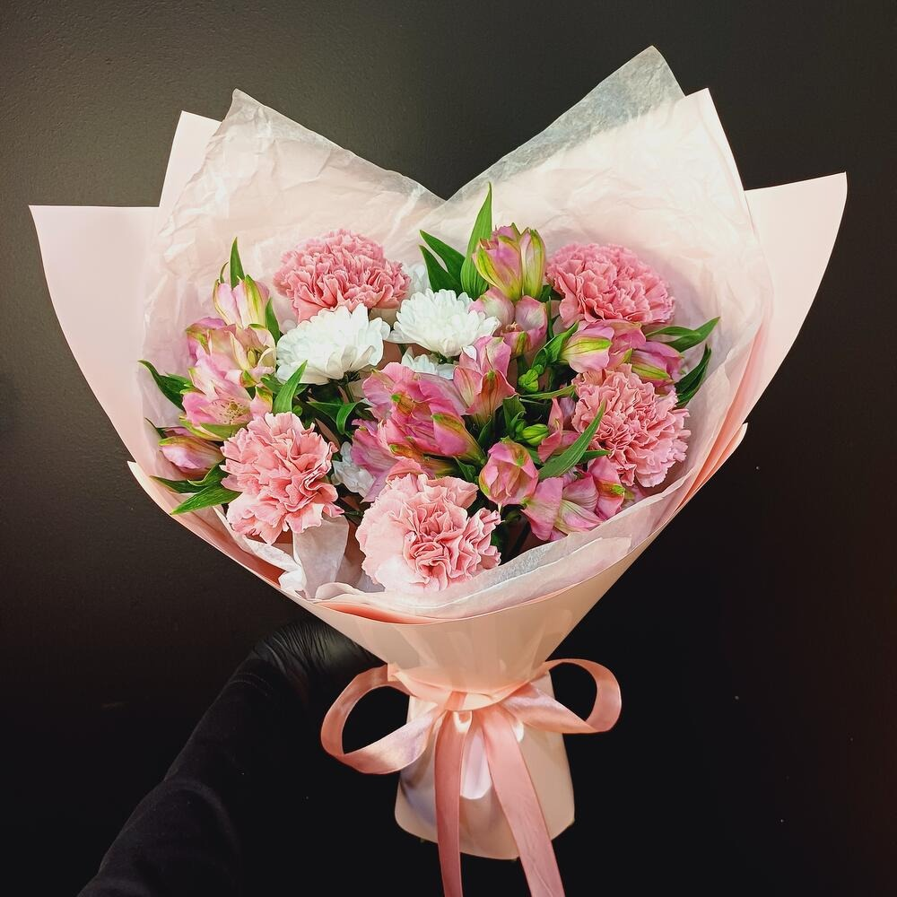 Букет трио с диантусами, альстромериями и кустовой хризантемой в упаковке