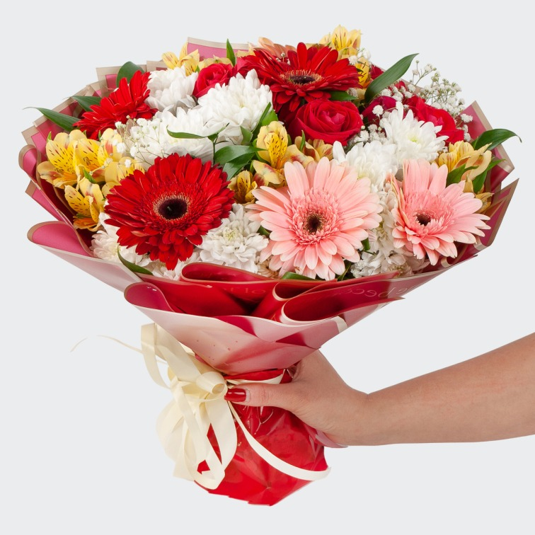 Яркий, свежий, полный радости и счастливых, добрых пожеланий подарок - букет из красных и розовых гербер, красных роз и белоснежных пышных хризантем, элегантных желтых альстромерий и сочных листьев декоративной зелени.