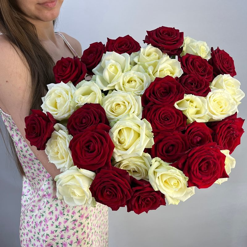 Состав букета: Роза красная 60 см - 18 шт; Роза белая 60 см - 17 шт;
