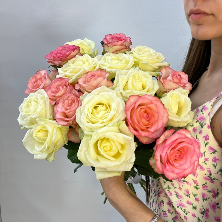 Состав букета: Роза бело-розовая - 9 шт; Роза белая 60 см - 10 шт
