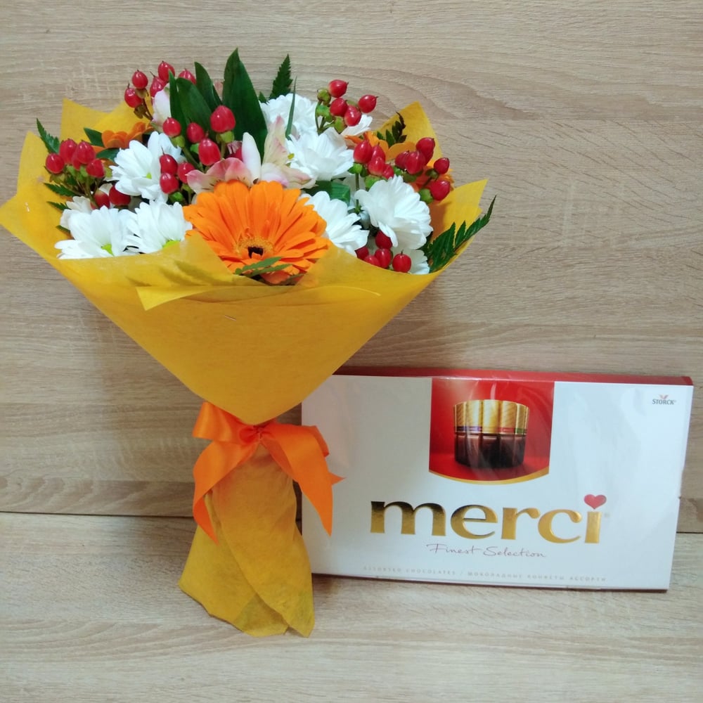 Подарочный набор «Букет цветов и конфеты» из хризантем и гербер