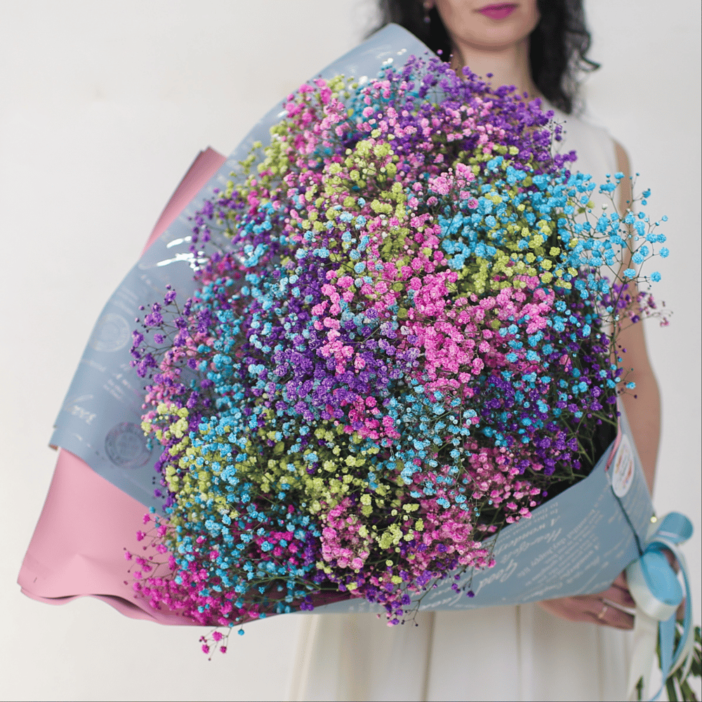 Гипсофила радужная. ✿Хит продаж! Выбор покупателей магазина. Долгие годы не уходит из моды сухоцвет-гипсофила. ✿Каждый стебель представляет собой соцветие из множества веточек. ✿Отличная цена, за счет постоянный поставщиков из Эквадора. ✿Такой букет будет стоять годами! После двух недель в вазе с водой, он превращается в сухоцвет. Особенности композиции: Высота 70 см. Изящное сочетание цветовой гаммы Яркая и пышная гипсофила оформлена стильной упаковкой Букет действительно выглядит пышно и имеет превосходную стойкость.