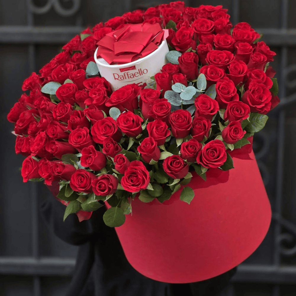Шляпная коробка с цветами «101 роза и рафаэлло»