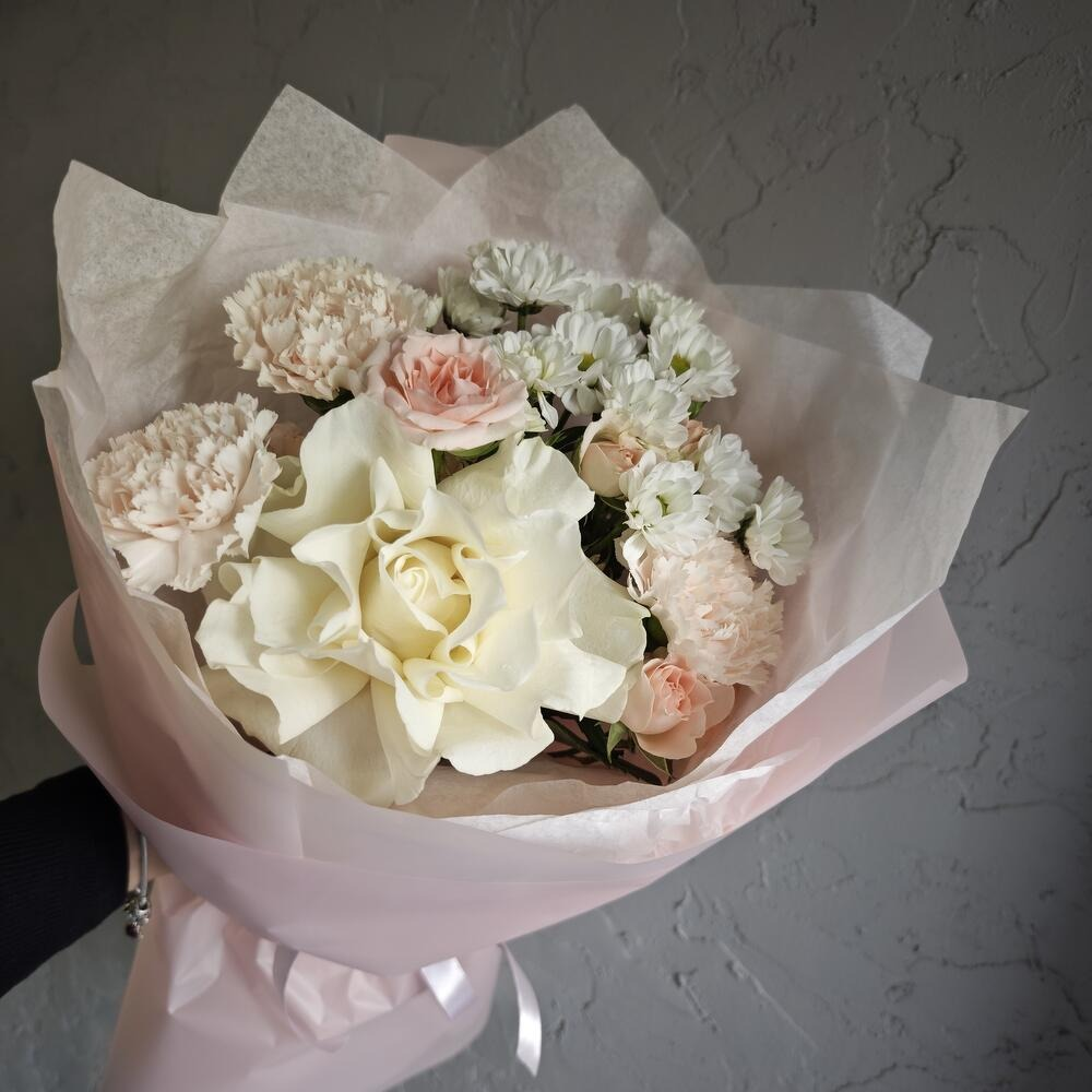 Букет "Твои поцелуи" (Сантини, роза французская, диантус, роза кустовая) В дополнении к нашим букетам идет сладкий подарок от магазина.