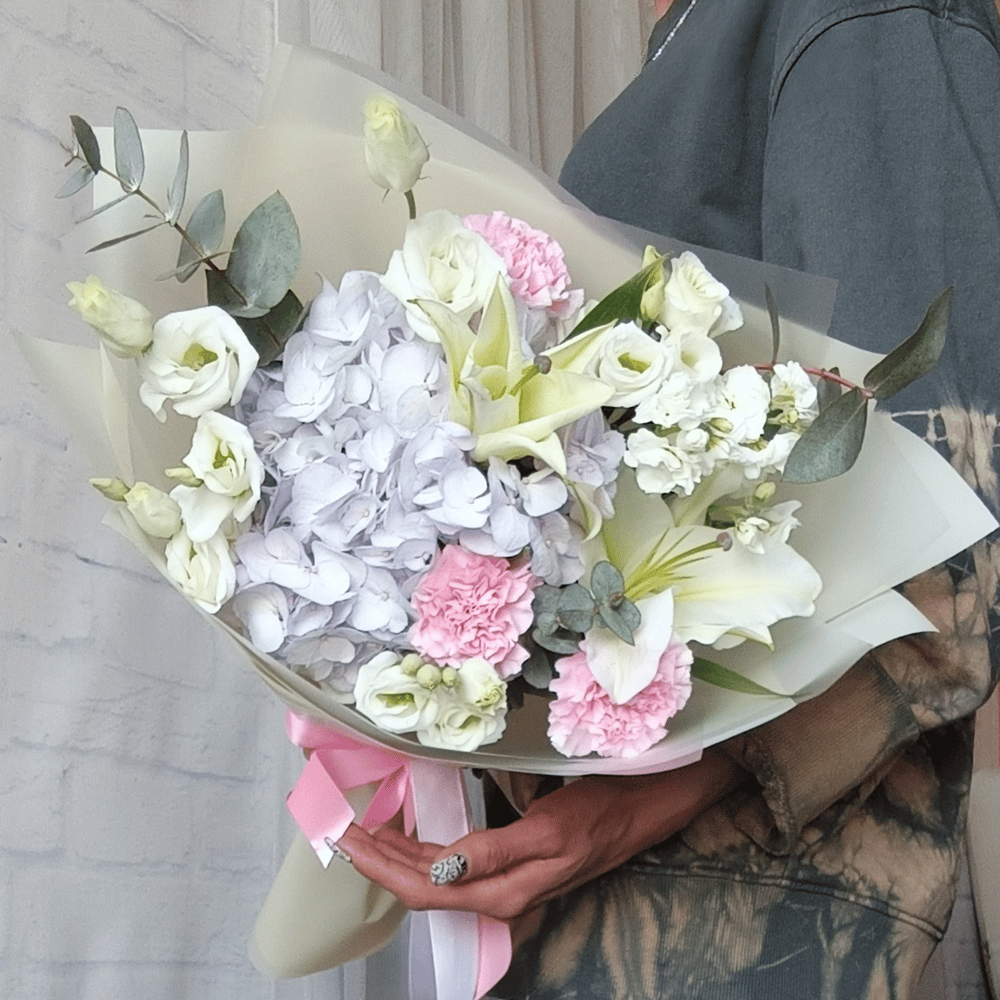 Уникальный букет, авторский, очень красивый, порадуйте своего получателя! 😍 Букет такой можно подарить на любой случай. Элегантность Лилии в окружении махровых Диантусов, воздушной Гортензии , и белых Лизиантусов словно гармония цветов и любви.