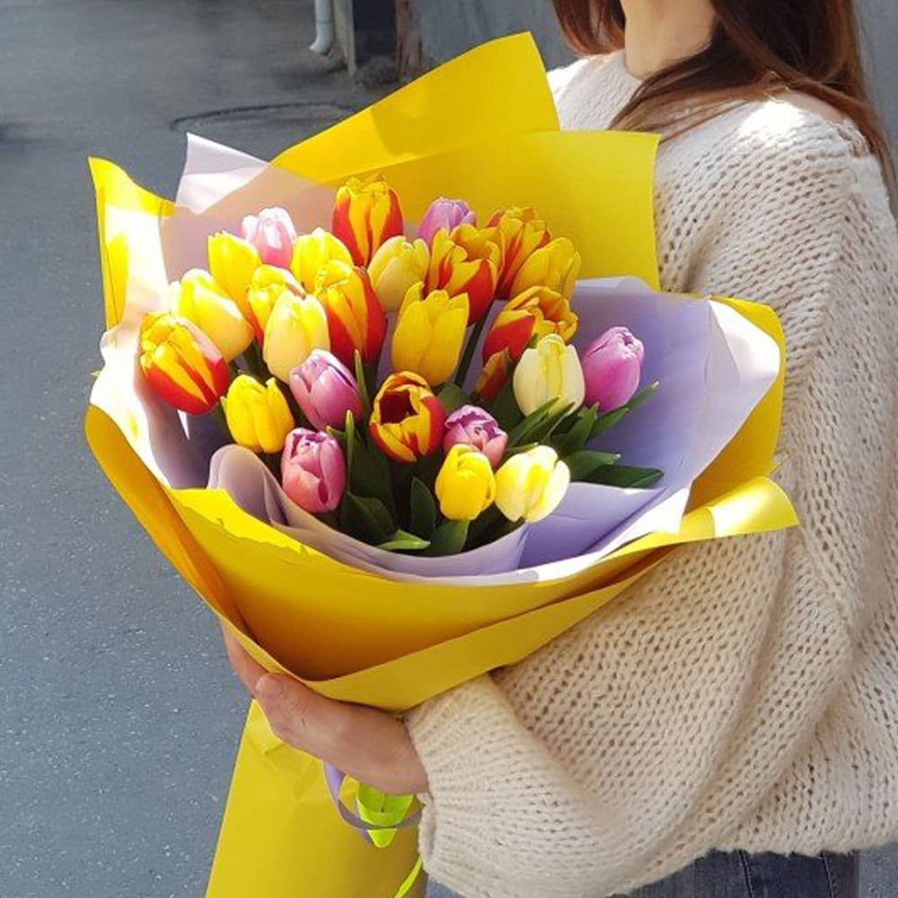 Букет из 25 тюльпанов микс в праздничном оформлении