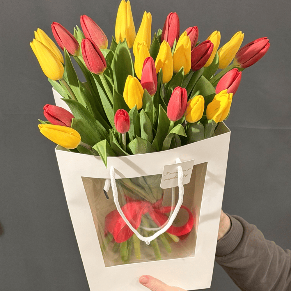 яркий букет из тюльпанов в стильном пакете