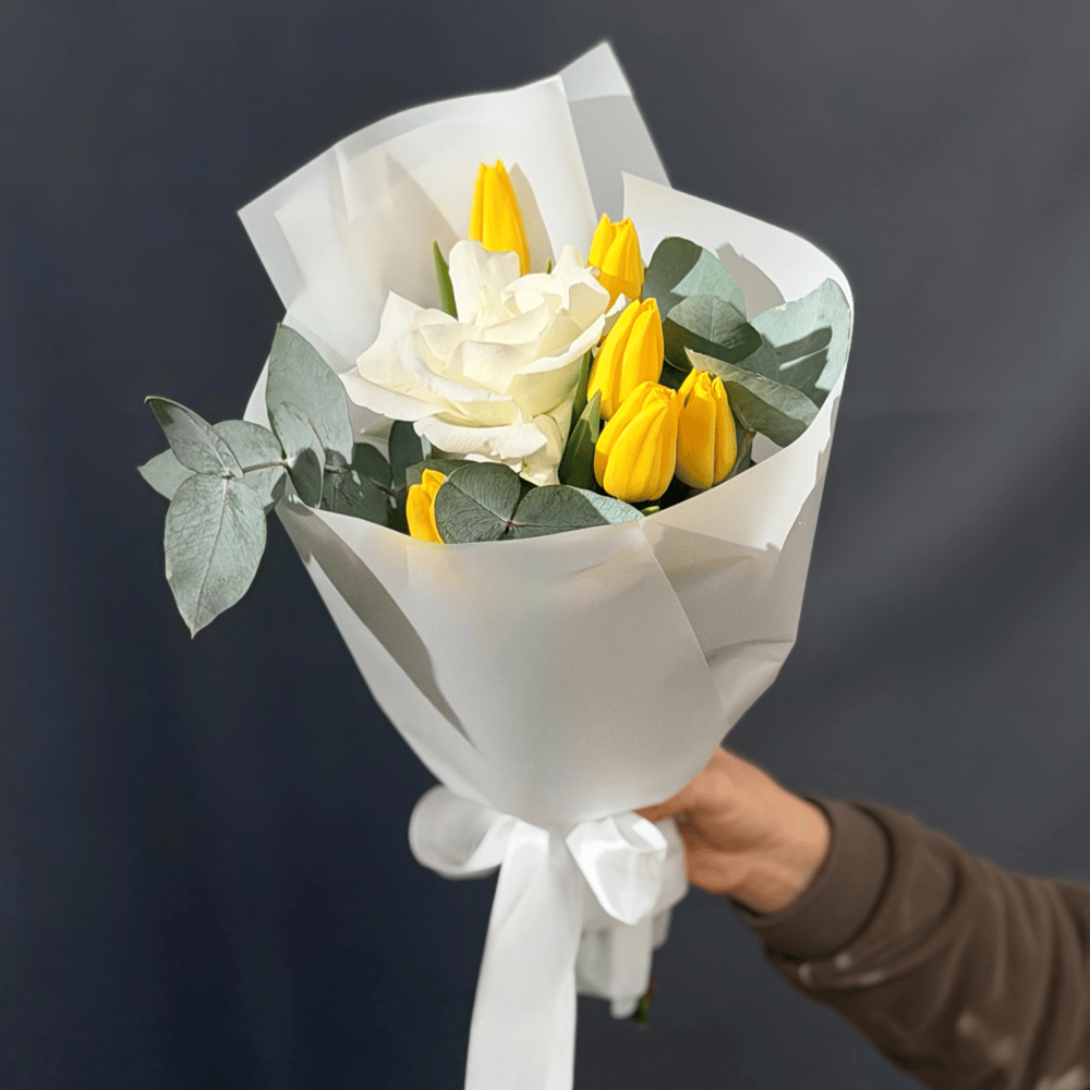 Небольшой стильный букет из тюльпанов и ажурной розы