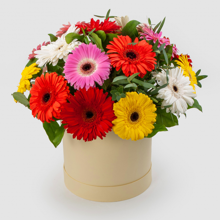 Яркие разноцветные герберы олицетворяют радостные чувства, доброту и счастье, служат символом полноты жизни. Прекрасный букет в шляпной коробке из 15 гербер разных цветов станет отличным подарком, ко…