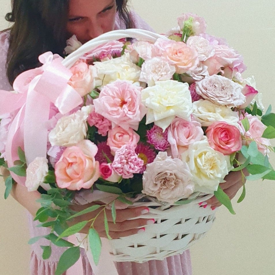 Букет в корзине Алиса из роз и эустом