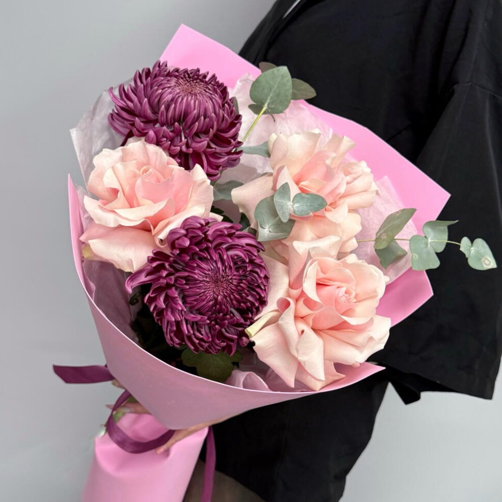 Стильный осенний букет из французской розовой розы, шикарной хризантемы пурпурного цвета и ароматного эвкалипта
