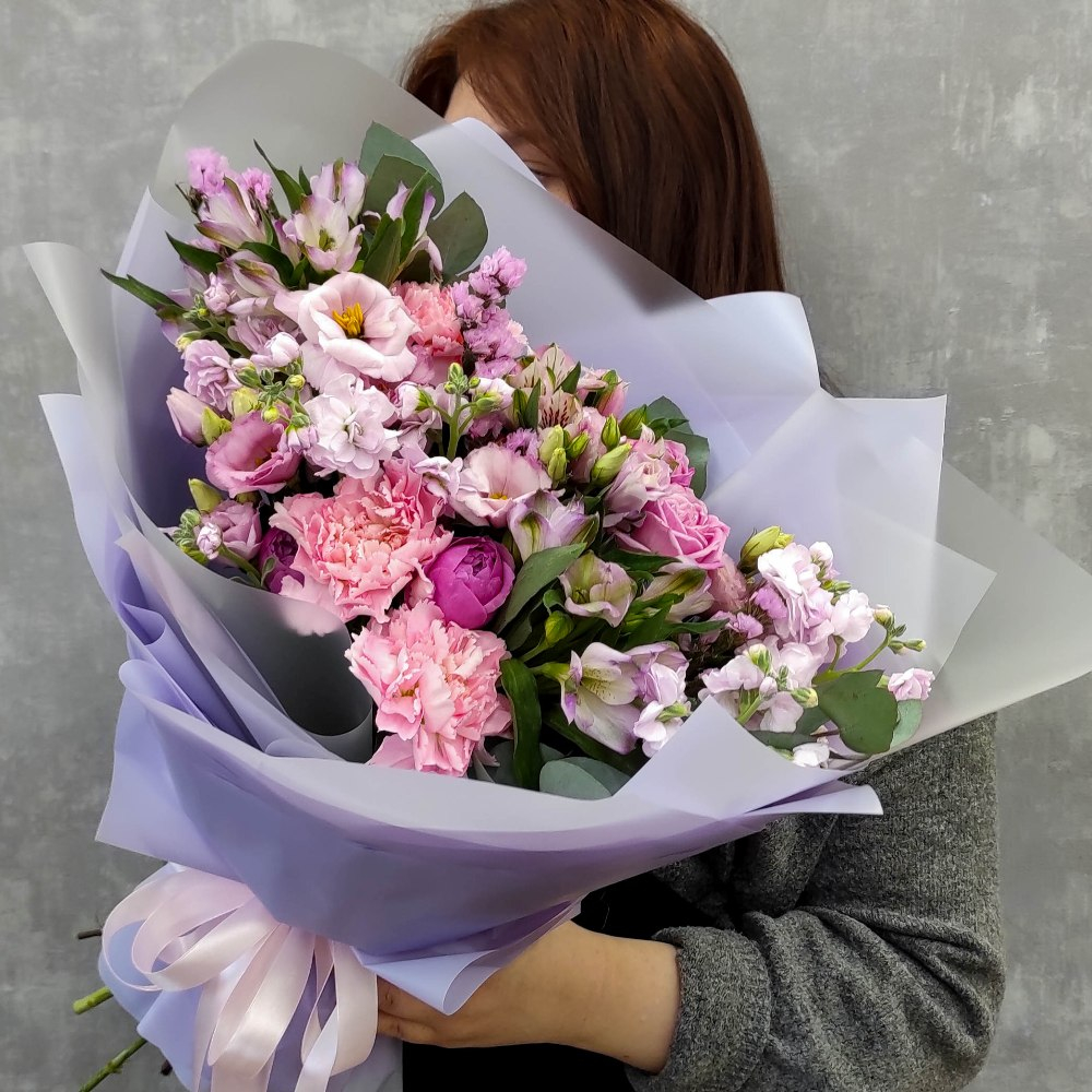 Состав: Альстромерия - 4 шт, Роза кустовая Misty Bubbles - 1 шт, Роза кустовая Lady Bomdastic — 1 шт, Статица Perpl - 2 шт, Эустома - 3 шт, Маттиола - 3 шт, Диантус Pink - 3 шт, Фисташка - 2 шт, Эвкалипт — 1 шт, Матовая пленка сиреневая и белая матовая прозрачная ушками Размер: Диаметр: 43 см / Высота: 55 см Красивый букет - это одна из самых главных составляющих любого торжественного праздника)) Красивые цветы и композиции могут быть как просто презентом, так и потрясающим свежим украшением любого интерьера! Сейчас набирает популярность просто так взять букет в вазу, не дожидаясь красивых дат и дня рождения, а радовать себя именно сейчас - сегодня! прекрасными и ароматными цветами))