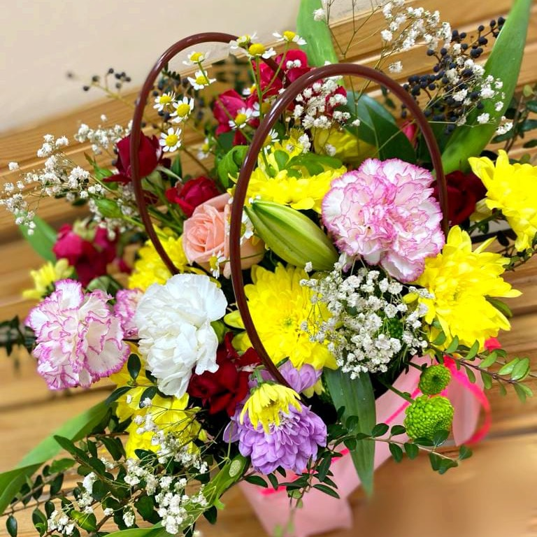 Букет в упаковке - сумочке - сочетает в себе яркость и нежность, привлекая внимание своим необычным дизайном. Он состоит из разнообразных цветов, которые придают ему неповторимый вид. В букете присутствуют гвоздики, хризантемы кустовые и филинг, розы кустовые и обычные, а также гипсофила. Гвоздики добавляют нотку классики и элегантности, хризантемы придают букету объем и насыщенность, а розы делают его изысканным и романтичным. Гипсофила же создает легкую и воздушную атмосферу, дополняя композицию своей нежностью. Вместе эти цветы создают яркий и неповторимый букет, который подарит радость и счастье вашим близким. Сумочка, в которой оформлен букет, придает ему дополнительный шарм и делает его отличным подарком на любой праздник или повод.