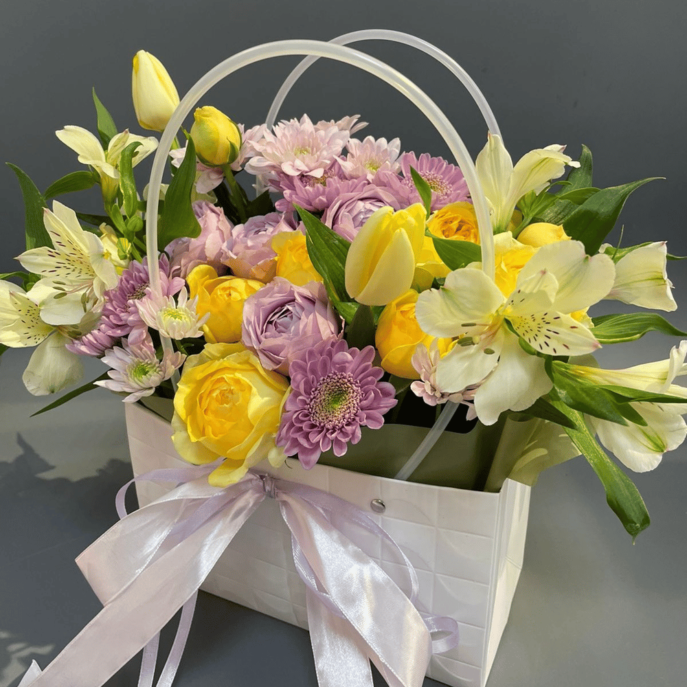 Прекрасный букет, составленный из нежных хризантем, ярких тюльпанов, изящных альстромерий и красивых роз, представлен в стильной упаковке - сумочке. Этот букет станет отличным подарком к любому празднику или просто для того, чтобы поднять настроение и порадовать близких.
