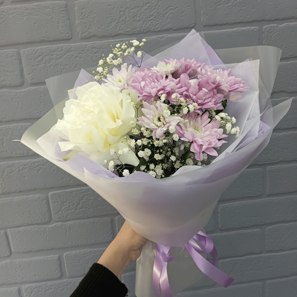 Нежный букет, с французской розой, пушисто-сиреневой хризантемой и гипсофилой, оформленный в матовую пленку