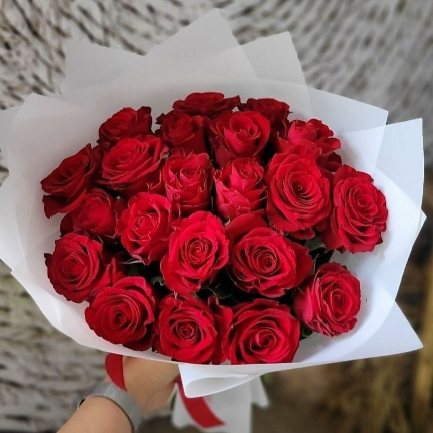 Красивый букет из 21 красной розы в белой упаковке порадует на день рождения, юбилей, свадьбу, рождение ребенка, а также на 1 сентября или выпускной.