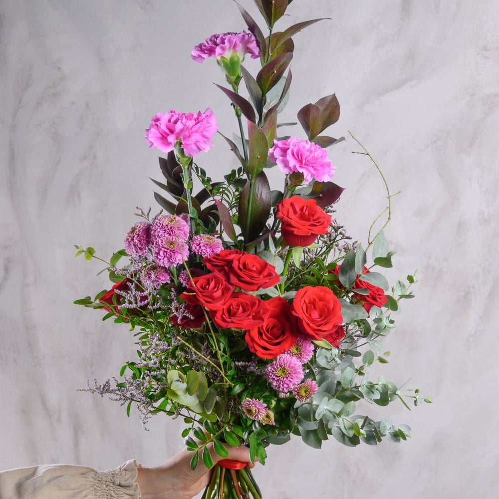 Букет яркий рассвет из роз и гвоздик