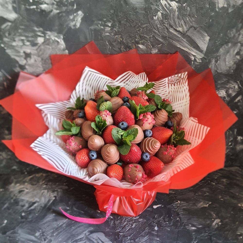Букет состоит из ягод клубники в молочной шоколаде с топпингами Обращаем Ваше внимание,что оттенок бумаги может немного отличаться Срок хранения 24 часа Сверху упаковываем прозрачной упаковкой