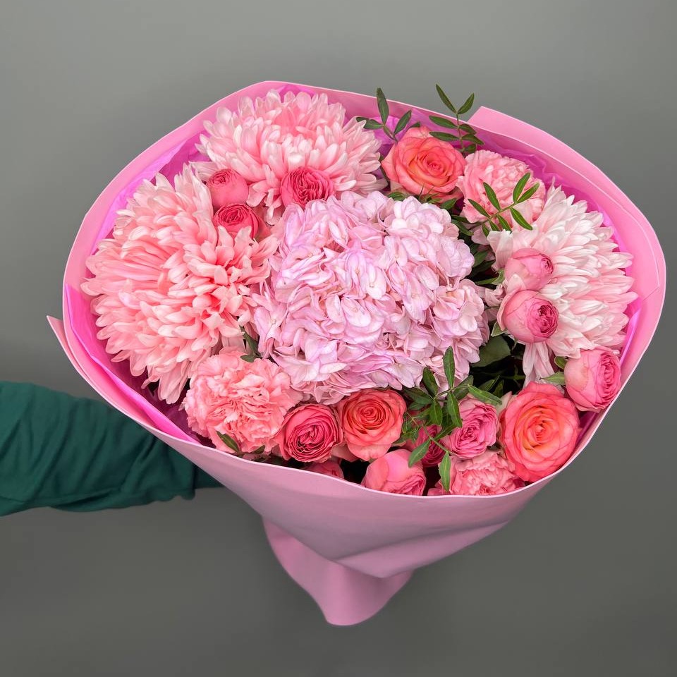 Букет зефир с гортензией и хризантемами из роз и гвоздик
