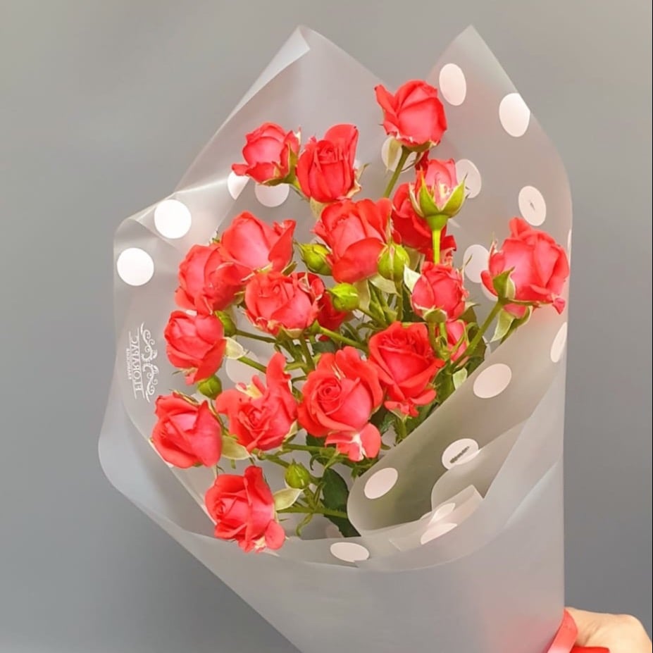 Лаконичный букет из нежных кустовых роз красного цвета — отличный способ сделать комплимент без слов.