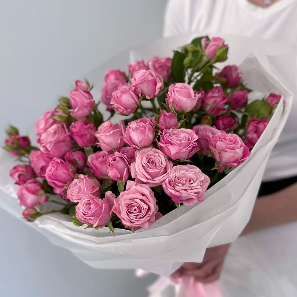 Букет из 7 пионовидных кустовых роз в фирменной упаковке.