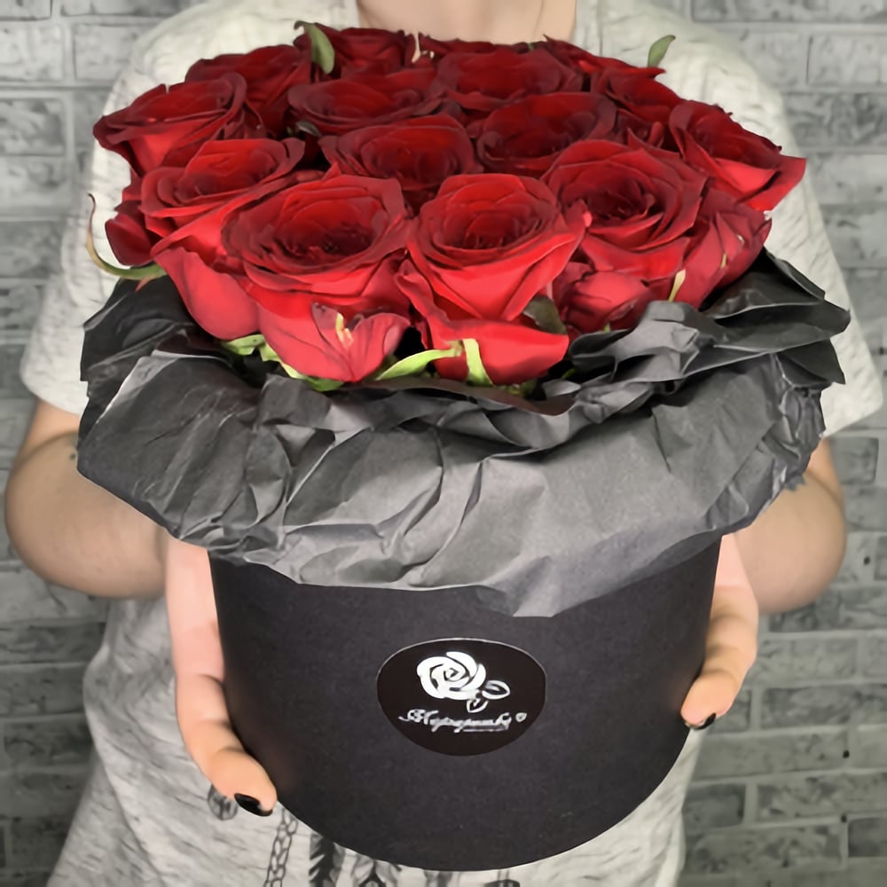 Шикарная огромная коробка с яркими и глубокими алыми розами в черном крафте и шляпной коробке. дорогой подарок дорогим людям.