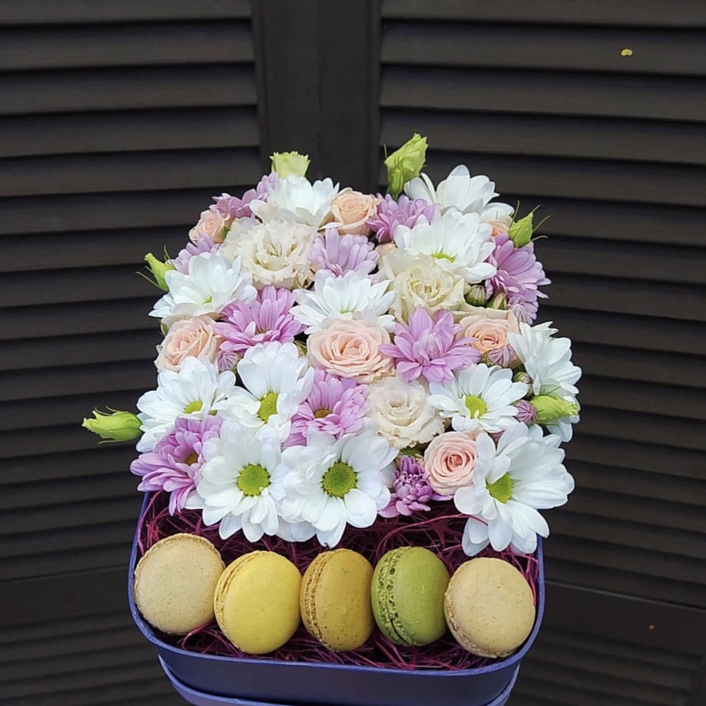 Подарочный набор «Цветочная композиция и макарон» из хризантем и роз