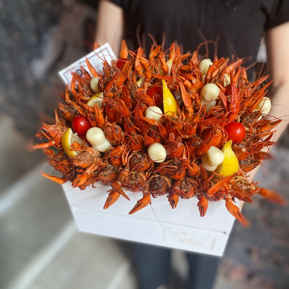 Букет из раков и овощей в декоративном ящике "Деликатесный №704"