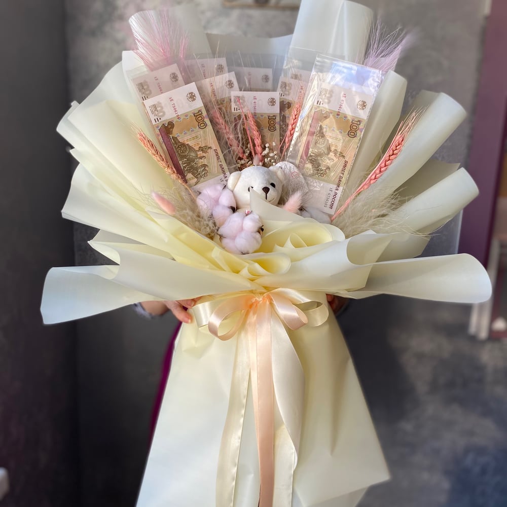Букет с мягкой игрушкой «мишка» и настоящими денежными купюрами - это оригинальный и креативный подарок.